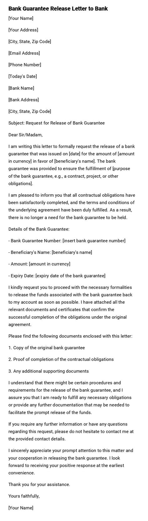 • Opening Paragraph: Briefly state your purpose – that you are requesting the release of the bank guarantee.