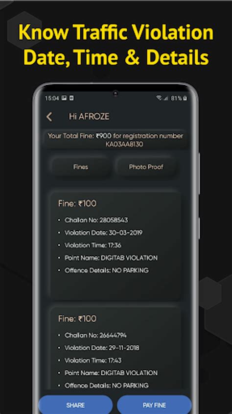 4. Check Your Fine Status: Once your vehicle is added, you can easily check your fine status with just a few taps. The app will connect to the Bangalore Traffic Police database and retrieve any pending traffic fines associated with your vehicle. The results will be displayed on the screen, along with details such as the date, time, location, and type of violation.