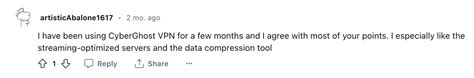 Positive Feedback: Many users are impressed with the trial experience. A common theme in positive reviews is the ease of use. Redditors frequently praise CyberGhost for its simple, intuitive interface, making it easy for even VPN newbies to get started. Other users rave about the vast server network , enabling them to easily access content from various regions. The speed and performance of CyberGhost are often highlighted as well, with users reporting smooth streaming and browsing experiences.