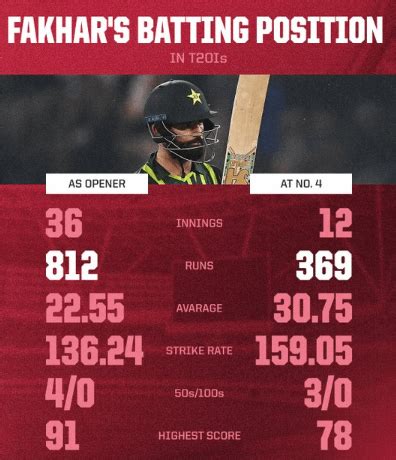 - Other T20 Leagues: Fakhar Zaman has also participated in other T20 leagues around the world, where his batting position has varied depending on the team’s requirements. In some leagues, he has opened the innings, while in others, he has batted in the middle order to provide stability and experience. His versatility and adaptability make him a valuable asset to any T20 team, regardless of the league or competition.