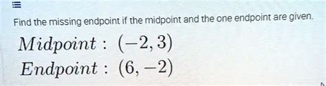 1. Identify the Given Information: The first thing you need to do is figure out what information you already have. Typically, you’ll be given the coordinates of one endpoint and the coordinates of the midpoint. Write these down clearly. For example, let’s say you know that one endpoint is at (2, 3) and the midpoint is at (5, 7).