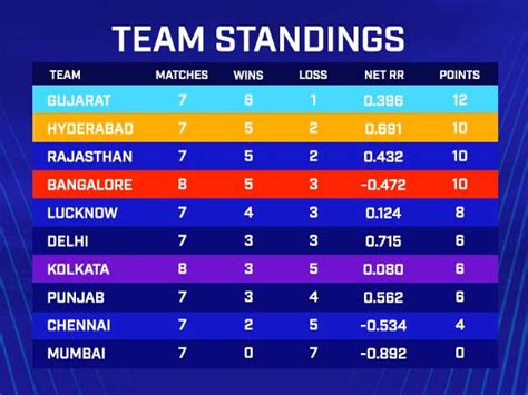 • Net Run Rate (NRR): This is a crucial metric! NRR is calculated based on the difference between the runs scored by a team and the runs conceded by them, divided by the number of overs faced. A higher NRR is generally favorable. The IPL point table takes NRR into high consideration to determine rankings.