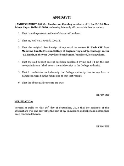 • Heading : Start with a clear heading: “Affidavit of Missing Receipt”.