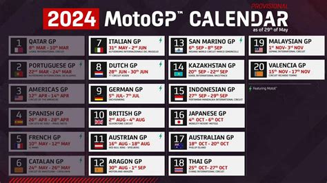 Nah, buat kalian yang pengen tahu kapan aja balapan seru bakal digelar, ini dia jadwal MotoGP 2024 yang udah dirangkum. Catat tanggalnya baik-baik ya, biar nggak ada yang terlewat. Jadwal ini bisa aja berubah sewaktu-waktu, jadi selalu cek update terbaru biar nggak ketinggalan info penting. Musim 2024 ini bakal dimulai di Sirkuit Lusail, Qatar, dan berakhir di Sirkuit Ricardo Tormo, Valencia, Spanyol. Ada beberapa seri yang jadwalnya agak berdekatan, jadi persiapin fisik dan mental kalian buat ngikutin semua keseruannya. Jangan lupa juga pantengin sesi latihan bebas dan kualifikasi, karena di situlah kita bisa lihat siapa yang lagi on fire dan siapa yang masih beradaptasi. Persaingan di setiap sesi bakal ketat banget, guys!