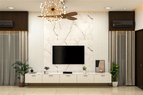 One popular minimalist design is a simple floating shelf made of wood or MDF. This shelf can be mounted directly to the wall and used to hold your media devices, such as a cable box or gaming console. You can also add a few decorative items, such as plants or picture frames, to personalize the space. However, be sure to keep the clutter to a minimum to maintain the minimalist aesthetic.