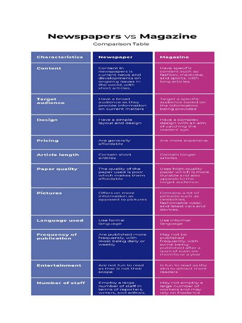 Okay, so we’ve covered a ton of differences: frequency, content specialization, target audience, writing style, visual presentation, paper quality, production methods, and advertising strategies. But the original question was, “Which of the following is not a difference of a magazine from a newspaper?” After all this detail, it becomes clear that most aspects are differences. However, if we had to pick something that isn’t a fundamental difference, it might be the broad underlying purpose of informing and engaging an audience . Both mediums, despite their different approaches, ultimately aim to provide information, entertainment, and a connection to the world around their readers. Whether it’s the daily local news in your morning paper or an in-depth look at a global issue in a monthly magazine, both serve to educate, entertain, and foster a sense of community or shared interest among their readers. They are both vehicles for storytelling and sharing knowledge. Another aspect that isn’t a defining difference, though it often manifests differently, is the use of visuals . While magazines are known for their glossy photos, newspapers do use images, albeit often in black and white and with a different aesthetic. The presence of visuals isn’t the differentiator, but rather their style, quality, and frequency .