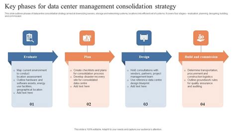 Alright, so you’re convinced that data center consolidation strategy is the way to go. Awesome! But how do you actually pull it off without making a giant mess? It all comes down to having a solid plan, and that plan needs to be built on a few key pillars. First up, you absolutely need thorough assessment and planning . This is where you roll up your sleeves and really get into the nitty-gritty of your current IT environment. What servers do you have? What applications are running on them? What are their dependencies? What are your current costs? You need to understand everything . This isn’t a quick coffee break task; it’s a deep dive that requires data analysis, stakeholder interviews, and a clear understanding of your business objectives. Without this foundational knowledge, you’re basically flying blind, and that’s a recipe for disaster. Next, you’ve got application rationalization . Not every app is created equal, guys. Some might be redundant, some might be outdated, and some might just be poorly performing. Consolidation is the perfect time to figure out which applications need to be migrated, which can be retired, and which might need refactoring or replacing. This step is crucial for ensuring that your consolidated environment is lean, efficient, and actually supports your business goals, rather than just moving old problems to a new location. Then there’s infrastructure modernization . Often, consolidation presents the perfect opportunity to upgrade your hardware and software. Think about embracing virtualization, cloud technologies, or hyper-converged infrastructure. These modern solutions are designed for efficiency, scalability, and easier management, making your consolidated data center way more powerful and future-proof. It’s not just about moving boxes; it’s about upgrading your capabilities. And let’s not forget data migration and testing . This is where the rubber meets the road. Moving your data and applications from multiple locations to a new, consolidated environment needs to be meticulously planned and executed. You need robust testing protocols to ensure that everything works as expected before you flip the switch. Downtime is the enemy, so thorough testing is non-negotiable. Finally, change management and communication are absolutely critical. This isn’t just an IT project; it impacts the entire organization. Keeping everyone informed, managing expectations, and providing adequate training is key to a smooth transition and user adoption. A successful consolidation isn’t just about the tech; it’s about the people too. Nail these pillars, and you’ll be well on your way to a successful and beneficial data center consolidation.