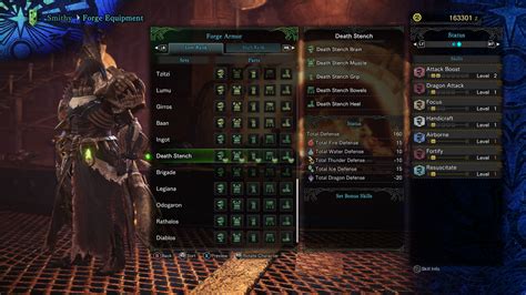 Another way to prevent and cure Death Stench is through your armor skills. There is an armor skill called Effluvial Expert , which you can obtain by equipping armor pieces or charms with the skill. Effluvial Expert will nullify the effects of effluvium, protecting you from Death Stench. Having this skill equipped will eliminate the health reduction altogether, which will enable you to hunt with confidence, knowing you have a defense against the debilitating effects of Death Stench. Keep in mind that armor skills can have different levels. Depending on how many levels you have invested in a skill, the effectiveness can be increased. So the more levels you have in Effluvial Expert, the better your resistance to effluvium will be.