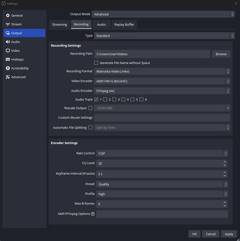 For recording, you have a bit more flexibility. You can often afford to use a higher bitrate and potentially a lossless or near-lossless codec for the best quality, as you’re not limited by upload speed. Under Type , choose Standard . The Recording Format is important; MKV is often recommended because it’s more robust – if OBS crashes, you won’t lose your entire recording. You can then use OBS’s built-in function ( File > Remux Recordings ) to convert MKV to MP4 later. For Encoder , you can use the same logic as streaming (NVENC/AMD preferred).