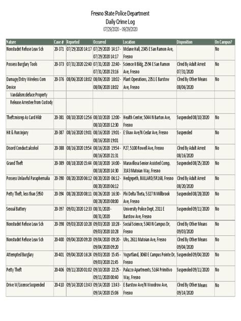Let’s get a little more specific. What kind of incidents might you actually see in the Penn State Daily Crime Log ? Here are a few examples to give you a clearer idea: Firstly, you might find reports of theft, such as the theft of a bicycle from a bike rack, the theft of a laptop from a classroom, or items stolen from a dorm room. The log would provide the date, time, and location of the incident, and a brief description of what was stolen. Secondly, there may be reports of vandalism, like graffiti on a building, damage to a vehicle parked on campus, or destruction of university property. The log will detail where and when the incident took place, and what was damaged. Thirdly, you can expect reports of assaults or other violent crimes, including physical altercations, threats, or any other incidents involving physical harm. The log would provide information on the nature of the incident and the location where it occurred. Fourthly, there might be reports of drug or alcohol-related offenses, like arrests for possession of illegal substances, or incidents of underage drinking or public intoxication. The log would include details about the type of offense and the location where it happened. Keep in mind that these are just a few examples. The specific incidents reported in the log can vary, but this gives you a good idea of what to expect. Understanding these examples will help you interpret the information in the log and understand potential safety risks on campus. So, always keep your eyes open, guys.