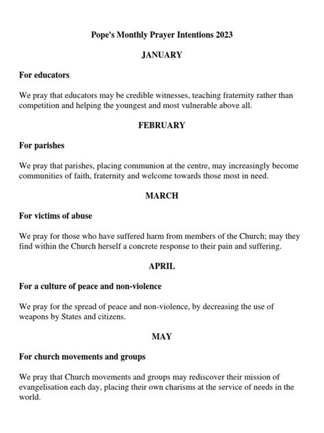Kicking off 2022, Pope Francis set a powerful tone with his prayer intention for true human fraternity . This is a big one, guys! It’s about more than just getting along; it’s about recognizing the inherent dignity in every single person, regardless of their background, beliefs, or circumstances. In a world often fractured by division, misunderstanding, and conflict, the call for fraternity is a beacon of hope. Think about it – how often do we see news headlines filled with strife? Pope Francis is urging us to pray for a profound shift in our hearts and in society, moving from indifference and hostility to genuine love and solidarity. This intention calls us to actively dismantle the barriers that separate us and to build bridges of understanding. It means reaching out to those who are different from us, listening to their stories, and seeking common ground. It’s about seeing Christ in the face of every neighbor, especially the marginalized and the forgotten. The Pope’s intention encourages us to reflect on our own biases and prejudices and to work towards overcoming them. True fraternity is the foundation for a peaceful and just world, where everyone feels valued, respected, and included. We are called to pray not just for ourselves, but for world leaders, for communities, and for every individual soul, that we might all embrace the radical love of Christ and live it out in our daily interactions. This intention challenges us to be agents of reconciliation, to be peacemakers, and to embody the message of the Gospel in a tangible way. It’s a call to action, asking us to move beyond passive acceptance of division and to actively cultivate relationships based on mutual respect and unconditional love. Imagine the impact if we all truly lived out this intention! It would transform our families, our communities, and indeed, the entire world. So, in January, let’s hold this intention close, praying that the spirit of true human fraternity may flourish and guide our actions throughout the year and beyond.