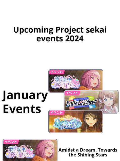 Alright guys, let’s talk about what makes Project Sekai events the absolute lifeblood of this rhythm game. These aren’t just random happenings; they’re carefully crafted experiences designed to immerse you further into the stories of Leo/need, MORE MORE JUMP!, Vivid BAD SQUAD, Wonderland x Showtime, and 25-ji, Nightcord de. Each event typically revolves around a new story chapter, introducing new character interactions, plot developments, and often, stunning new cards to collect. The core of every event is the event score ranking and point ranking . You play songs, earn points, and climb the leaderboards. The higher you rank, the better the rewards! This competitive edge adds a thrilling layer to the gameplay, pushing you to perfect those chart-clearing skills. But it’s not all about competition; the narrative aspect is huge. The event stories allow you to see your favorite characters in new light, explore their struggles, triumphs, and relationships. Sometimes, you’ll even see characters from different units interacting, which is always a treat! Think of it as seasonal content for your favorite anime, but you get to actively participate and influence your rewards. The event rewards are a massive draw, featuring limited-edition character cards with unique illustrations, powerful stat boosts, and sometimes even new outfits for your characters. These cards are often key to performing better in future events, making participation a strategic decision. Plus, the sheer variety keeps things fresh. Whether it’s a heartwarming story about friendship, a dramatic tale of overcoming adversity, or a hilarious escapade from Wonderland x Showtime, there’s always something to look forward to. So, when we talk about a pjsk event list , we’re not just listing dates; we’re talking about a roadmap to new stories, new challenges, and new ways to connect with the game and its characters. It’s the pulse that keeps Project Sekai vibrant and exciting, constantly offering fresh content and opportunities for players to engage and grow.