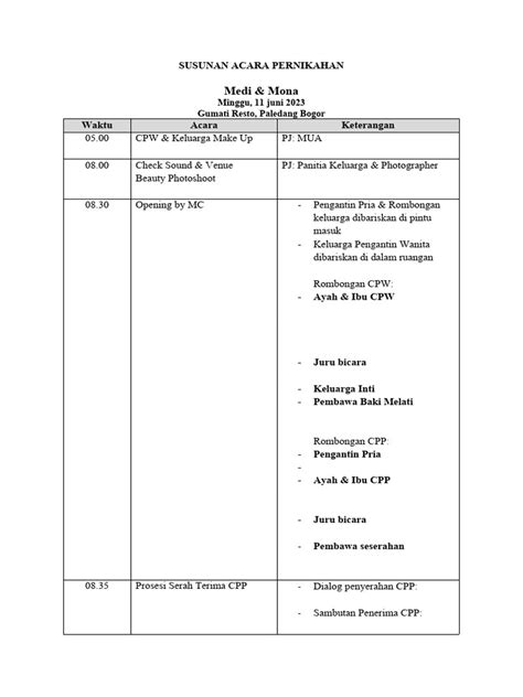 Hey everyone, planning a wedding, especially one steeped in tradition like a Javanese wedding, can feel like navigating a maze! You’ve got so many amazing rituals and customs, and figuring out the perfect order to weave them all together can be a real head-scratcher. That’s where a well-crafted rundown comes in super handy. It’s your secret weapon for keeping things on track, ensuring you don’t miss any important moments, and, most importantly, allowing you to actually enjoy your special day! In this guide, we’ll dive deep into creating a fantastic wedding rundown for a Javanese wedding, complete with examples, tips, and everything you need to make your celebration unforgettable. We’ll explore the essence of a Javanese wedding rundown, providing a framework that you can adapt to your preferences. The rundown serves as the backbone of your event. It is a detailed timeline that outlines the order of events, from the early morning preparations to the final goodbyes. It keeps everything moving smoothly, minimizing potential hiccups and maximizing the enjoyment for everyone involved, especially you two lovebirds! Think of it as your wedding’s roadmap to success, ensuring every ritual, every speech, and every dance flows seamlessly. It also helps manage vendors, coordinate family members, and keep guests informed. So, whether you’re a couple planning your big day, a family member helping out, or simply curious about Javanese weddings, this guide is for you. Let’s get started and make your Javanese wedding a truly magical experience. The most important thing is to make sure the rundown captures the essence of your love story and honors the rich traditions of Java. By the time we’re done, you’ll be well on your way to crafting a wedding rundown that’s both efficient and beautiful, reflecting the grace and elegance of Javanese culture.